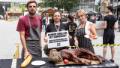 Tierschützer erregten am Samstag die Aufmerksamkeit vieler Passanten, priesen Teile eines gegrillten Hundes zum Verzehr an.Foto: Johannes Galert Via: Aktion für mehr Tierwohl – PETA grillt Hund in Düsseldorfer Innenstadt